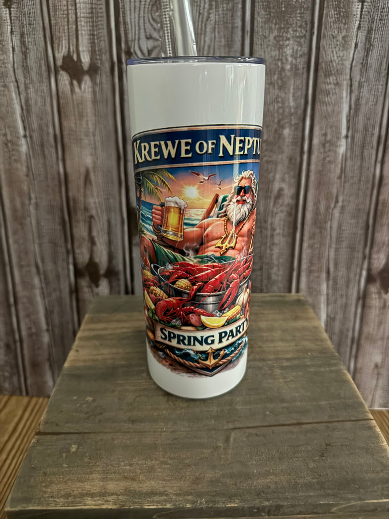 Krewe of Neptune Spring Party bundle includes a performance Tshirt and your choice of a 20 oz tumbler or beverage holder with free personalization.